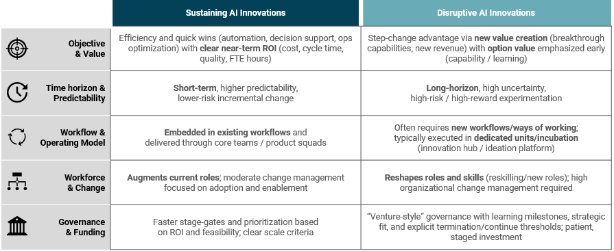 Disruptive AI innovations pursue fundamentally new capabilities, operating models, or data monetization opportunities that reshape competitive positioning. They operate over longer time horizons, carry greater uncertainty, and require the formation of new workflows and roles. New value creation may include breakthrough capabilities, step-change competitive positioning, and new sources of revenue. Early value can be appropriately captured through strategic learning and option value (e.g., validated technical feasibility, pilot performance thresholds, and a clear path to scale) before financial ROI becomes the primary lens.